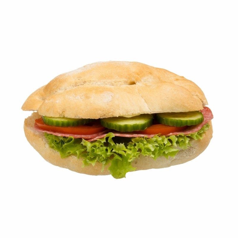 Bułka pszenna z masłem, sałatą, ogórkiem świeżym i pomidorem, do wyboru z serem żółtym lub szynką konserwową, lub salami.