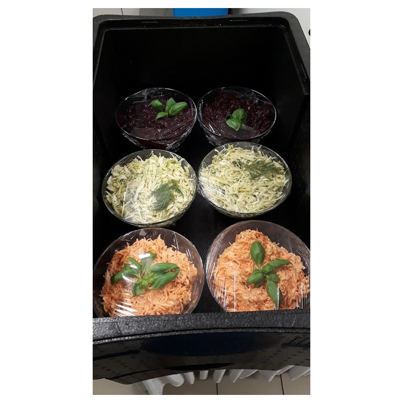 Potrawy dostarczone zimne lub gorące, na paterach tradycyjnych lub jednorazowych, zupa zgrzana hermetycznie w pojemniku do przelania w wazy.